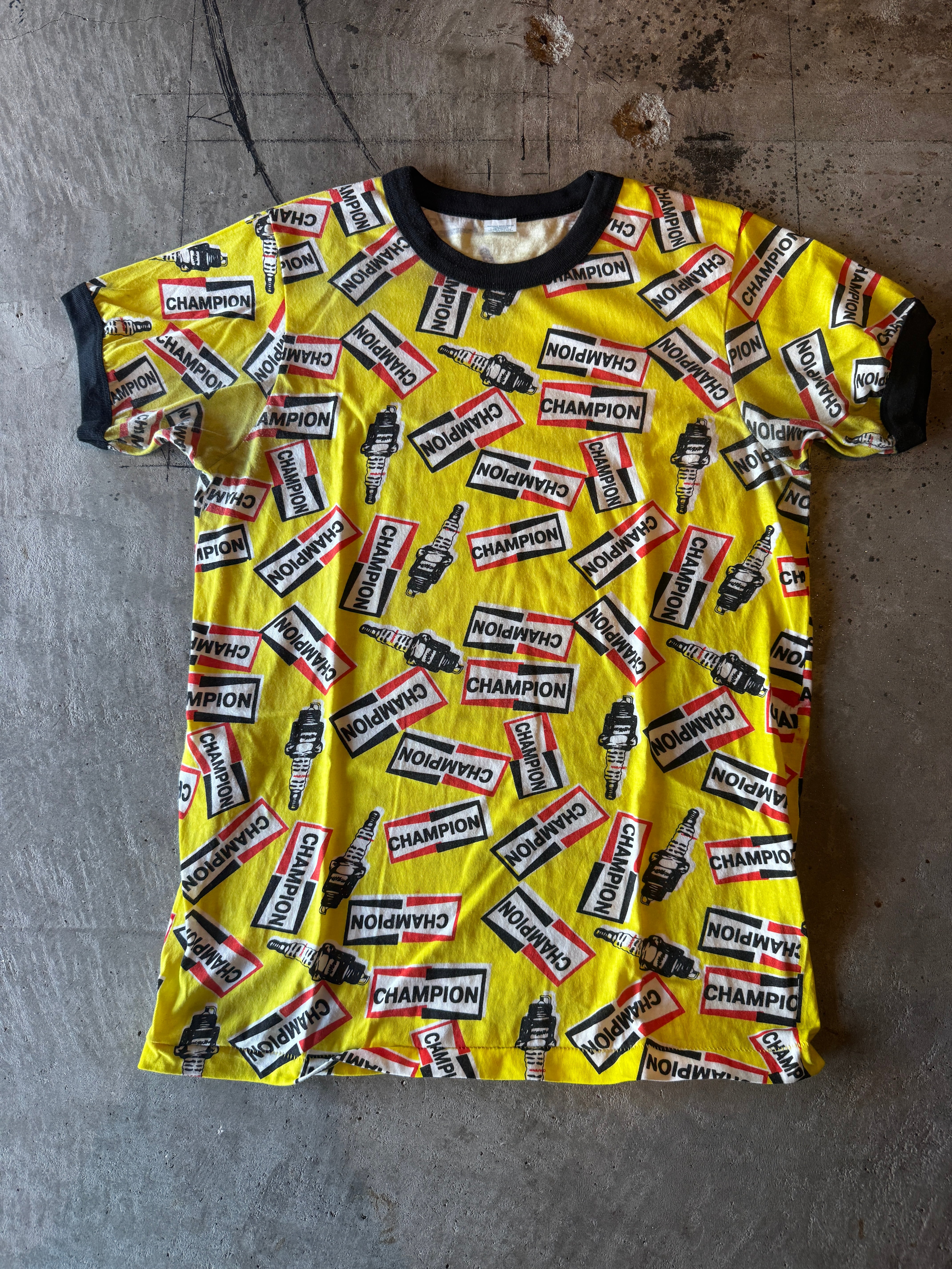 80S チャンピオンスパークプラグ 総柄 リンガーTシャツ USA製