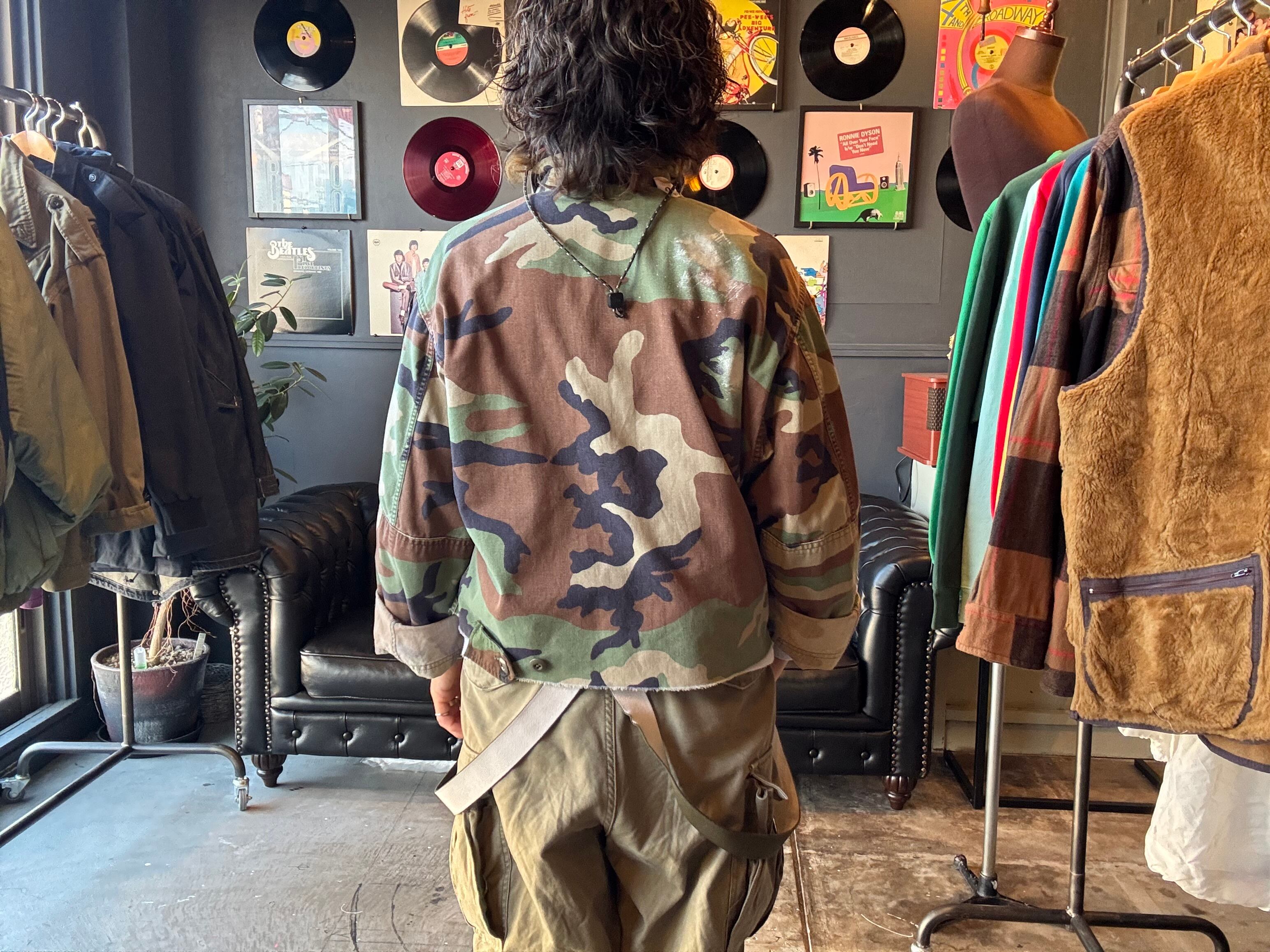 古着のBDUジャケットを再構築し、左右で異なるカラーのパネルを組み合わせた一点物。